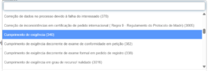 Após isso, selecionar a opção “Cumprimento de Exigência (código 340)”. Uma vez que a exigência foi formulada durante o exame do pedido de registro, o requerente deve escolher a modalidade “Em processo de registro”.